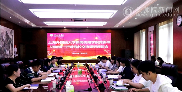 本网讯 7月22日上午,上海外国语大学新闻传播学院党委书记樊娟、办公室主任向丽华、副主任刘洁韵、教师李美、夏琪、辅导员郑涵一、万诗云、赵信智一行到pp电子调研交流,pp电子党委委员、副校长邹晓青出席会议,文学与传媒学院副院长陈欣、教学科研科科长秦雪影、系主任吕菁、学生党支部书记潘健强、教研室主任涂雨秋和教师骆雪参加会议。文学与传媒学院党委书记王军主持会议。