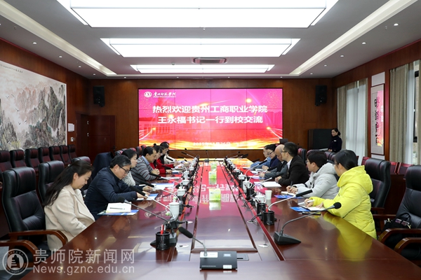 本网讯 11月26日下午,贵州工商职业学院党委书记王永福、校长周刚一行到pp电子考察交流,pp电子党委书记石培新、副校长郭文、纪委书记 邬卫东等校领导热情迎接了王永福一行,在信息楼二楼会议室举行了两校交流座谈会,会议由郭文主持。