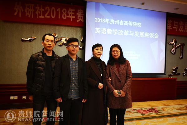 本网讯 11月25日,由贵州省外语学会、贵州省大学外语教学研究会和外语教学与研究出版社共同举办的“2018年贵州省高等院校英语教学改革与发展座谈会”在贵阳贵州饭店国际会议中心二楼安顺厅举行,省内各高校的院系负责人、教研室负责人、教师代表师参加了此次座谈会。贵州省外语学会会长、pp电子外国语学院院长余学军应邀参加并作为主持人主持英语专业教育交流分享会,外国语学院副院长罗泳、教研室主任代表张录文和教师代表程俊龙一同参加了此次座谈会。