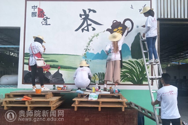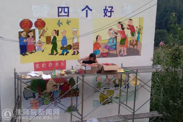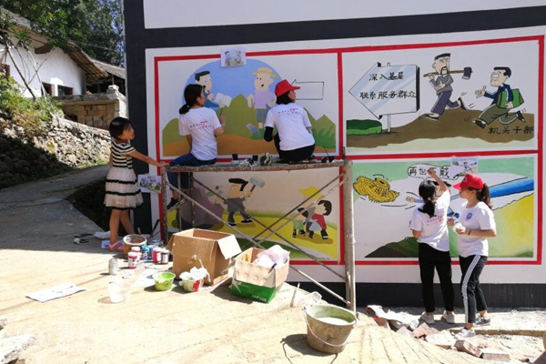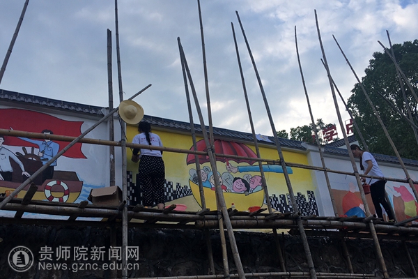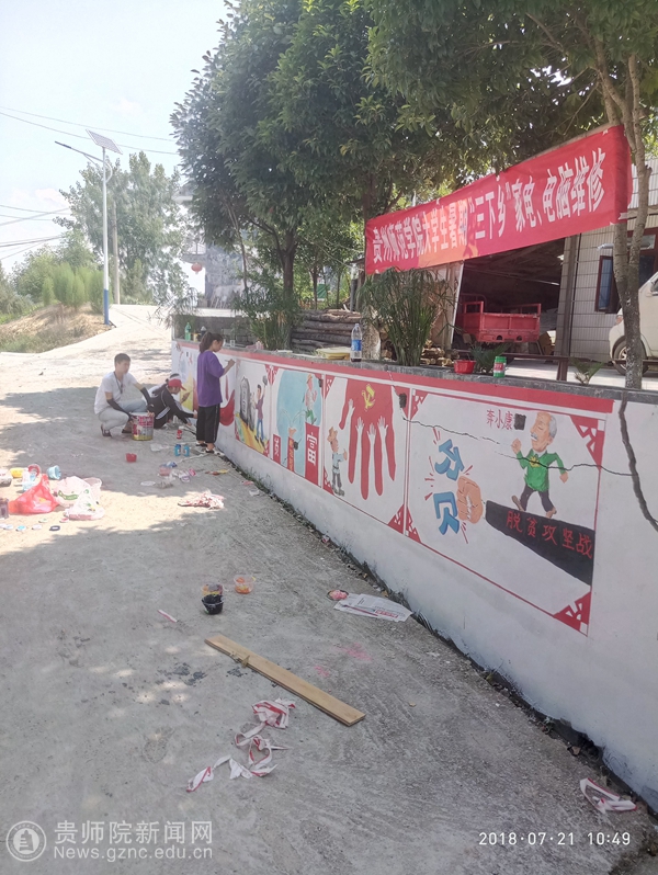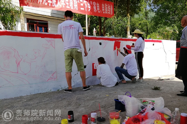 pp电子志愿服务队伍抵达各个帮扶村之后,便对各个村子的风土人情和地形地貌做了详细的了解,并为各个村“量身定制”了一系列的墙绘方案。每天志愿者们一到工作地点就斗志昂扬地投入到工作中,分配作画区域、确定每个人绘画的内容、根据墙画的大小分组,准备笔、墨、颜料等各种工具,便开始了紧张的“工作”。杨柳塘村、川岩村、黔溪村、青杠林村等村庄的墙面比较高,都需要用竹子搭架子。志愿者们在搭建的架子上小心翼翼地进行绘画。很多村庄的墙面比较高,站在架子上都够不着墙面,志愿者们就想法设法地解决问题,画不到的地方同学们就拿杆子绑着画笔进行绘画。有些村庄的墙面多,由于脚手架还没有运到,所以有些志愿者们只能在临时搭建的简易架子和桌子上进行绘画。志愿者们每天顶烈日、冒酷暑,在缺少防护措施的各个帮扶村忙碌着。修补墙面缺陷、补乳胶漆、划线、打底色、勾外形、上色彩,十几名同学分工合作,就这样热火朝天地干起来了。整个社会实践活动期间,为了早日完成各个村的墙画任务,志愿者们每天早出晚归,结合中国画、各种书法字体,为pp电子的帮扶村专门设计绘制了山水画、花鸟画以及以党建、脱贫攻坚、社会主义核心价值观等为内容的墙画作品。多彩的颜料在同学们的妙笔下生辉,墙画作品构图合理、内容雅致,活泼逼真的画面既增加文化底蕴,营造良好的传统文化氛围,奠定了学习传统文化、营造良好民风的基础,也在无形中宣传了传统文化和文明理念,在美化乡村的同时推动了文明乡村的创建。兼具教育意义和观赏价值的墙画受到当地政府和村民的一致好评。