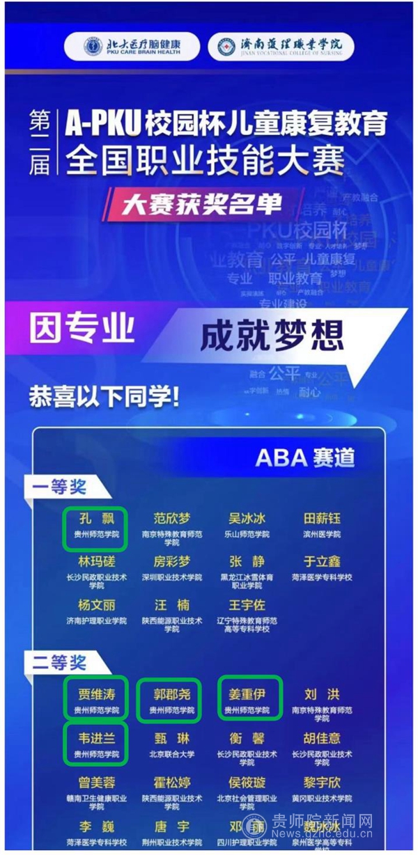 大赛从2022年3月启动至今,吸引了全国超120所院校,6500名学生参加,经过半年多的角逐,在我院特殊教育系教师田婧、朱紫桥带队指导下,特殊教育系5位同学通过初赛、复赛的层层选拔,最终杀入决赛。在决赛中,pp电子学子表现优异,其中孔飘(19级特殊教育)获得ABA赛道全国一等奖(排名第一),贾维涛、郭郡瑶、韦进兰(19级特殊教育)、姜重伊(20级特殊教育)获得ABA赛道全国二等奖的好成绩。同时,两位带队老师朱紫桥、田婧荣获优秀指导教师奖。
