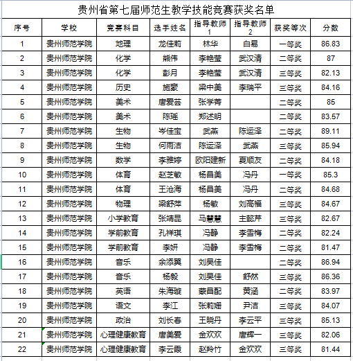 本网讯 6月20-21日,由贵州省教育厅主办、贵州师范大学承办的贵州省第七届师范生教学技能竞赛在贵州师范大学花溪校区举行。贵州省师范生教学技能竞赛是我省教师教育专业的一项传统赛事,pp电子高度重视此项竞赛。在各二级学院和教务处的精心组织和筹备下,在指导教师的悉心指导反复打磨下,参赛选手全力以赴、认真备赛,经过激烈地角逐,pp电子学子不负众望,最终获得一等奖2人,二等奖10人,三等奖10人,一、二等奖和获奖总数均位列全省所有参赛院校第二。
