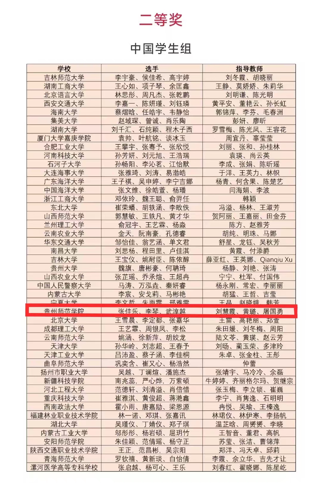 此次全国高校学生跨文化能力大赛,以“坚定文化自信 增进国际理解”为主题,吸引了来自28个省市自治区1000多所高校的3000多名学生参加。前期经校赛、省赛比拼,pp电子张佳乐、李琴、武淳越三位同学组成的pp电子游戏官网代表队,同贵州大学代表队一道成为首次晋级全国决赛的贵州高校代表队。决赛现场,经过案例开发与展析、名言名句解读、知识问答、情境述评和讲述中国故事等多项比赛环节的考察,最终荣获国奖二等奖。