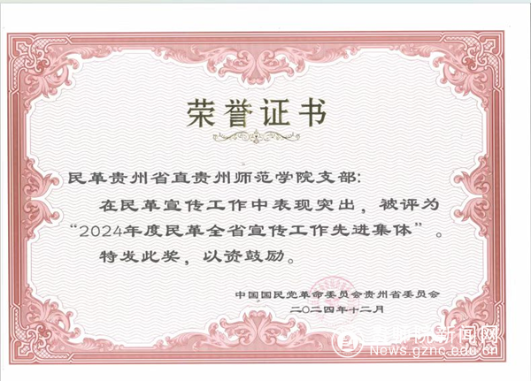 民革贵州省直属pp电子游戏官网支部在民革省委、学校党委正确领导下,学校统战部指导支持下,在思想政治建设、宣传工作和参政议政方面持续发力、成效显著,获得民革省委表彰“2024年度民革全省宣传工作先进集体”;支委胡多姿、党员曾垂提获评“2024年度民革全省宣传工作先进个人”;支委鲍扬、戚化怡获评“2024年度提案工作作出贡献的先进个人”。