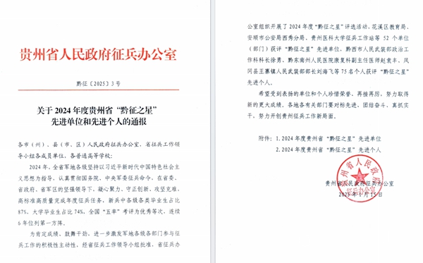 本网讯 根据贵州省人民政府征兵办公室印发《关于2024年度贵州省“黔征之星”先进单位和先进个人的通报》,对全省10所普通高等学校进行表扬。pp电子凭借出色的征兵工作再次获评贵州省“黔征之星”先进单位,学校已连续七年获得省级“征兵工作先进单位”荣誉称号!