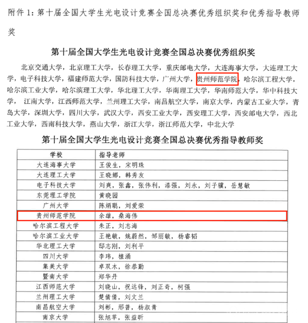 第十届全国大学生光电设计竞赛全国总决赛优秀组织奖和优秀指导教师奖
