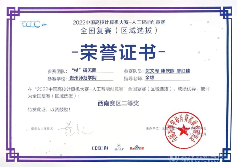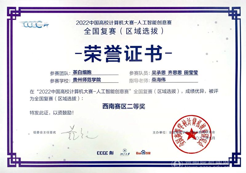 本网讯 近期,由全国高等学校计算机教育研究会主办,信息技术新工科产学研联盟人工智能人才培训基地协办的第五届(2022年)中国高校计算机大赛-人工智能创意赛如期举行。pp电子“杖”碍无阻代表团队(指导老师:余雄 团队成员:贺文周、康庆雄、廖红佳)与茶白细胞代表队(指导老师:桑海伟 团队成员:吴承思 齐思思 田莹莹)荣获本次比赛西南赛区二等奖2项。