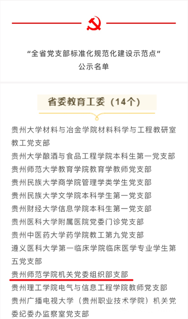 本网讯 2020年8月10日,中共贵州省委组织部公示了第一批“全省党支部标准化规范化建设示范点”拟命名对象名单,在公示的200个示范点中,省委教育工委共有14个院校基层党支部入选,pp电子机关党委组织部支部入选“贵州省党支部标准化规范化建设示范点”。