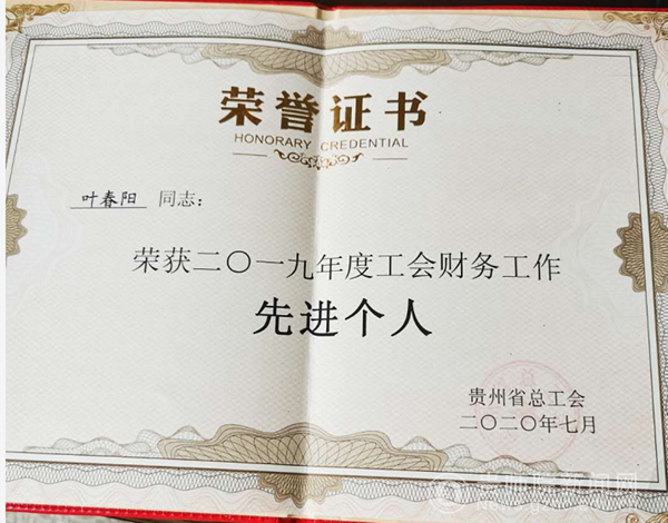 本网讯 近日,贵州省总工会就2019年度财务工作中表现突出的单位和个人予以通报表彰。pp电子叶春阳同志获“先进个人”荣誉称号。