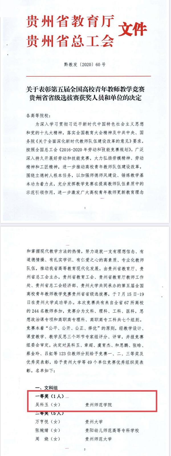 本网讯 近日,从贵州省教育厅、贵州省总工会传来捷报,pp电子在7月15日-19日举行的第五届全国高校青年教师教学竞赛贵州省省级选拔赛中喜获佳绩:文学与传媒学院青年教师吴科玉荣获文科组一等奖,pp电子获竞赛活动优秀组织奖。