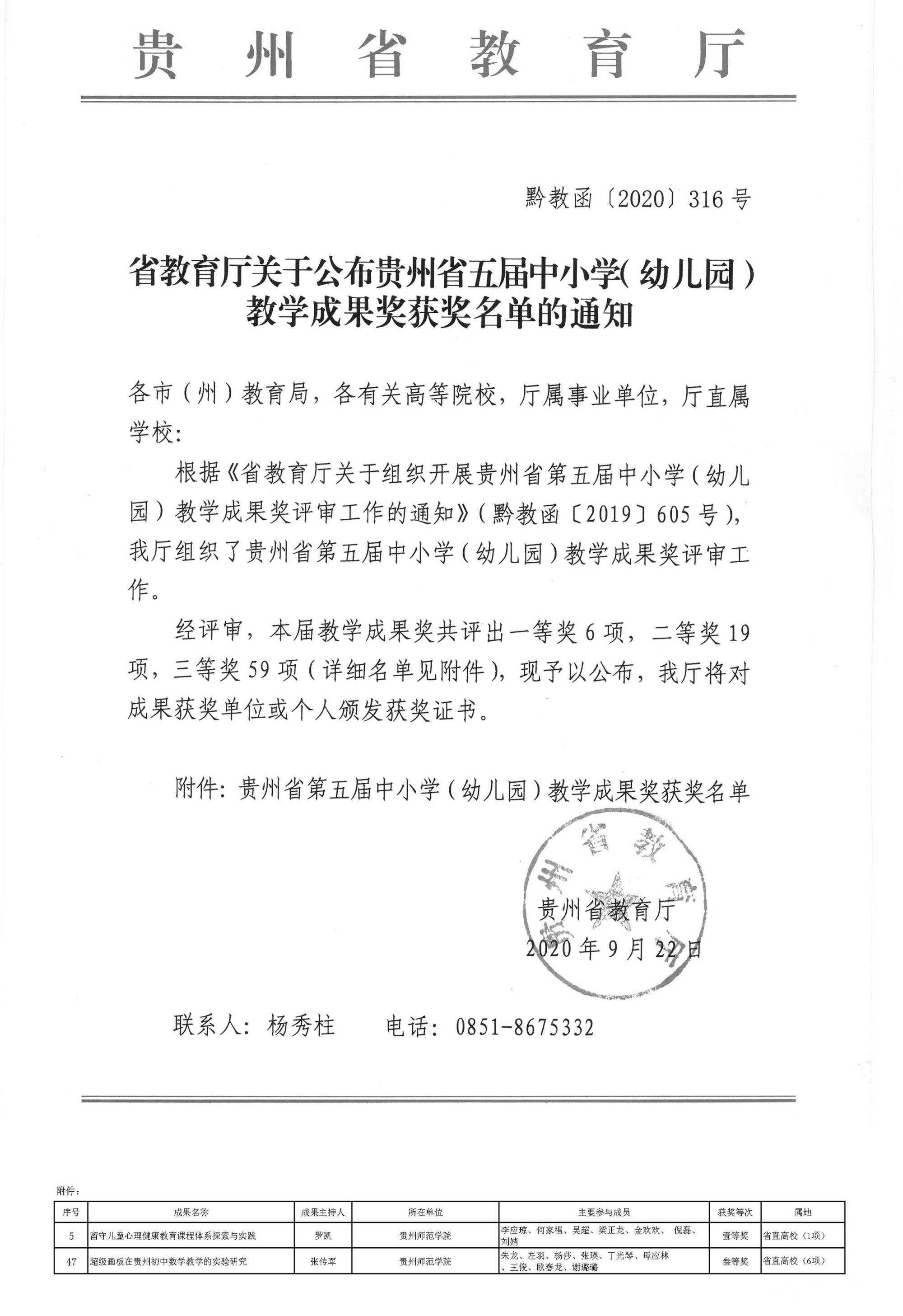 本网讯 由贵州省教育厅主办的贵州省第五届中小学(幼儿园)教学成果奖评选活动,经过各单位组织申报、省教育厅评审委员会评审,并将评审结果进行公示后,近期省教育厅下发了《省教育厅关于公布贵州省五届中小学(幼儿园)教学成果奖获奖名单的通知》(黔教函〔2020〕316号)。pp电子教育科学学院罗凯的《留守儿童心理健康教育课程体系探索与实践》荣获一等奖,是省直高校中唯一获得一等奖的高等院校;教育科学研究所张传军的《超级画板在贵州初中数学教学的实验研究》荣获三等奖,在省直高校中pp电子为6项三等奖获奖院校之一。希望老师们再接再厉,再创佳绩!