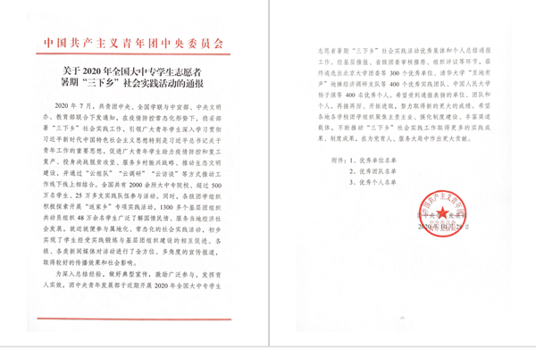 本网讯 近日,团中央青年发展部对在2020年全国大中专学生暑期“三下乡”活动中表现突出的优秀单位、团队与个人进行了总结表彰。pp电子童心绘梦志愿服务队荣获2020年全国大中专学生志愿者暑期“三下乡”社会实践活动优秀团队。
