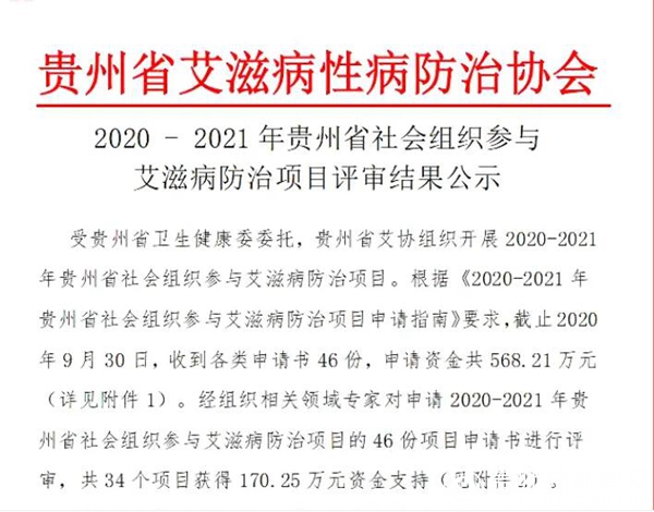 本网讯 由省防艾协会组织开展的2020-2021年贵州省社会组织参与艾滋病防治项目已经通报了评审结果,经过省疾控、省防艾协会相关领域专家评审,pp电子报送宣传教育主题活动类:“易青春·同伴你我行”防艾宣传教育项目获得立项和资金支持。