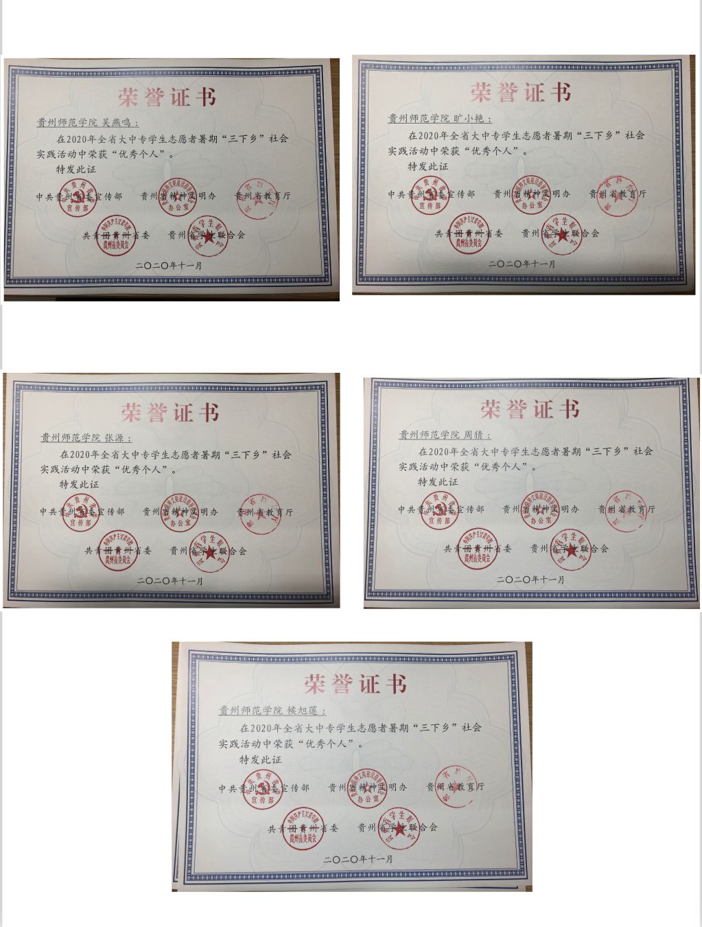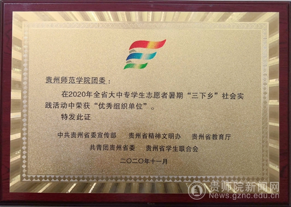 本网讯 近日,省委宣传部、省精神文明办、省教育厅、团省委、省学联对2020年全省大中专学生志愿者暑期“三下乡”社会实践活动突出的团组织、团队、个人进行通报表扬。pp电子团委荣获2020年全省大中专学生志愿者暑期“三下乡”社会实践活动优秀组织单位;数学与大数据学院“智慧云教•科技助黔”暑期三下乡社会实践服务团队荣获2020年全省大中专学生志愿者暑期“三下乡”社会实践活动优秀团队,教育科学学院老师张源、文学与传媒学院学生周猜、数学与大数据学院学生侯旭莲、外国语学院学生旷小艳和马克思主义学院学生吴燕鸣荣获2020年全省大中专学生志愿者暑期“三下乡”社会实践活动优秀个人。