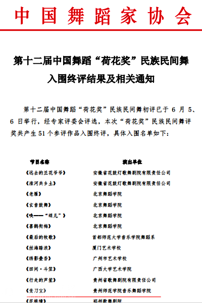 本网讯 近日,由中国文学艺术界联合会、中国舞蹈家协会主办的中国舞蹈“荷花奖”初评比赛在北京举行,pp电子音乐舞蹈学院选送的作品《贵刀宝》成功进入下一轮比赛。此次活动共收到全国五百多个作品参与评选,经专家评委会层层选拔,共产生51个作品入围决赛。
