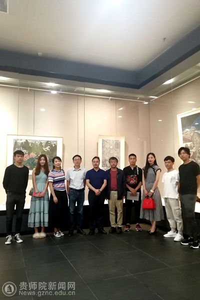 美术与设计学院师生在2017级美术学专业学生王喜意的入选版画作品前合影
