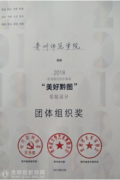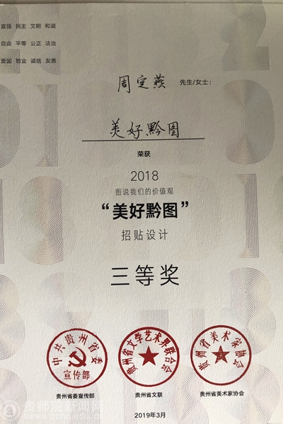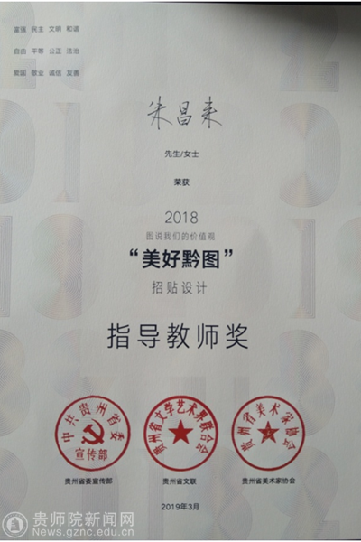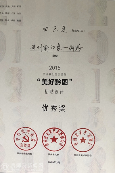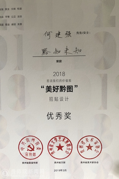 本网讯 近日,由省委宣传部、省文联、省美术家协会组织的第四届“图说我们的价值观·美好黔图”公益广告设计征集活动。美术与设计学院组织了2018级产品设计专业、2016级视觉传达设计班参加。经过专家严格初评与复评,评审出一等奖1名,二等奖2名、三等奖3名,特别奖1名,优秀奖30名,优秀团体组织奖1名,优秀指导教师奖2名。其中,pp电子游戏官网荣获团体组织奖,朱昌来荣获指导教师奖。2016级视觉传达班周定燕同学系列作品《美好黔途》荣获三等奖,何建强同学系列作品《黔知未知》、田玉莲系列作品《贵州新印象》荣获优秀奖;参赛作品表现形式丰富,突出时代性,运用现代艺术手段,增强传播力和感染力,主题鲜明、创意新颖、通俗直观、生动感人。