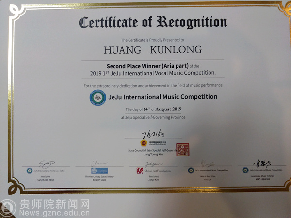 本网讯 8月14日晚,第二届济州国际音乐比赛暨首届济州国际声乐大赛颁奖典礼在美丽的汉拿大学艺术厅隆重举办。济州特别自治省政府国会议员Jang Yong Kim 代表省政府依次为获奖选手颁奖,并与获奖选手及市民朋友一起欣赏了专家评审代表、优秀选手及西归浦市中学生管弦乐团的精彩演出。pp电子音乐舞蹈学院2015级学生黄坤龙参与比赛并荣获歌剧咏叹调组二等奖。