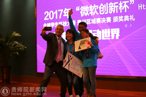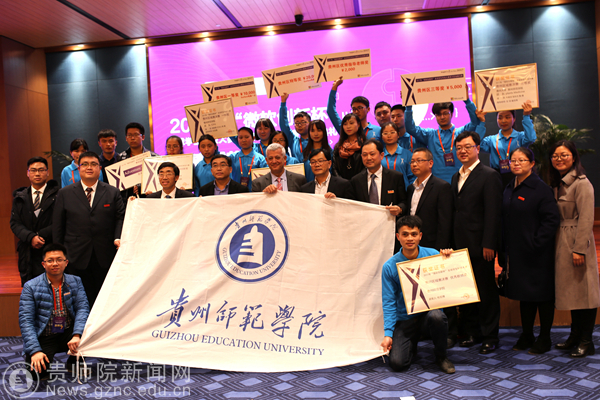在欢快的音乐中,贵州师范大学党委书记韩卉、黄健、亚历克斯(Alex)、陈永军分别为获得三等奖、二等奖、一等奖、特等奖的团队颁发了获奖证书,获奖团队代表发表了获奖感言,分享了创新创业的经历,并合影留念。