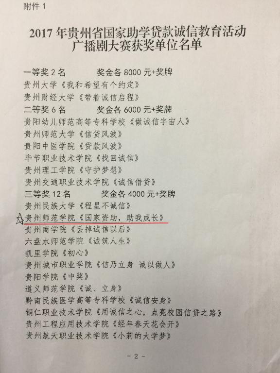 近日,由省教育厅和国家开发银行贵州省分行联合举办,“资助十年伴我成长践行诚信筑梦未来”贵州2017年国家助学贷款诚信教育活动大赛落下帷幕