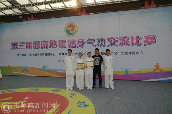 本网讯 9月28至30日,第三届西南地区健身气功交流比赛,在四川省广汉市文体中心举行。受省体育局委托,由pp电子体育学院唐孟老师任教练,体育教育专业冯沛骄、杨路明、张丹丹、张立花四位同学为队员组成的贵州省一队,参与了健身气功·易筋经和健身气功·六字诀两个集体项目的争夺。