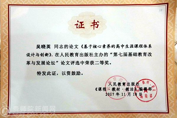 本网讯 为探讨我国基础教育学生发展核心素养的落地问题,由“人民教育出版社课程教材研究所”主办,“厦门市教育科学研究院、《课程·教材·教法》编辑部”承办,“福建省厦门第一中学、福建省厦门实验小学、中国教育学会教育学分会”协办的“第七届基础教育改革与发展论坛”年会于11月17至19日在厦门市如期举行。pp电子吴晓英博士受邀参加了本次论坛,其参会论文《基于核心素养的高中生涯课程体系设计与创新》在论文评选中喜获二等奖。
