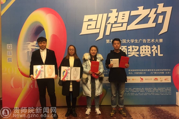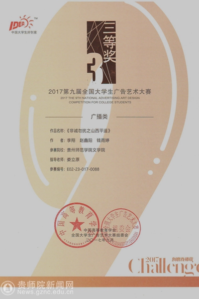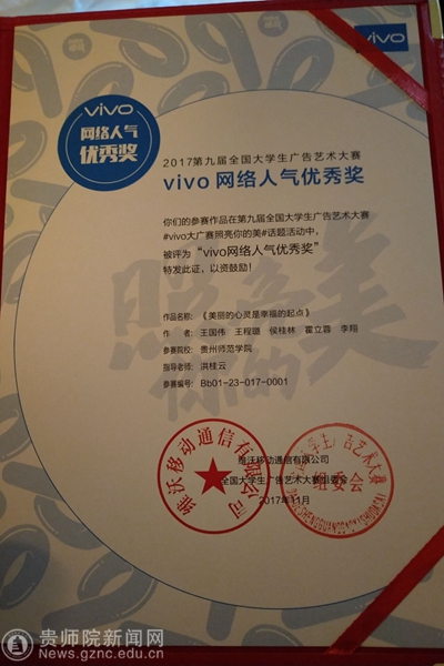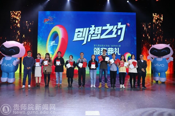 第九届大广赛主题口号为“创意我挑战”,共有1301所高校(2819所学院)参赛,参赛学生超过80万。经校级初选后,共收到作品173870组(约36万件)。经过三个月的省级评选、全国评审、网上公示,最终优中选优产生全国等级奖。pp电子文学院共有两件作品获得国家级奖项,其中张敏同学创作的广播作品《告白》(指导老师:龙红莲、潘源)获得全国二等奖,李翔、赵鑫阳、钱雨婷同学创作的广播作品《非诚勿扰之山西平遥》(指导老师:娄立原)获得全国三等奖。本届大广赛的优秀作品在爱奇艺、中国广告网开展了“最佳网络人气奖”评选,共产生16名获奖者。pp电子文学院学生斩获两项vivo最佳网络人气奖。获奖学生代表张敏、李翔、王国伟、涂朝耀上台领取了奖品和证书。本届获奖成绩是pp电子在该赛事中的最好成绩,也是贵州赛区作品在全国总决赛中的最好成绩。