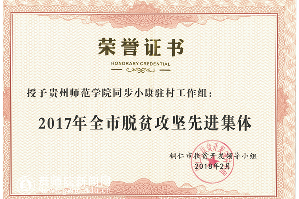 本网讯近日,pp电子同步小康驻村工作组被铜仁市扶贫开发领导小组表彰为2017年全市脱贫攻坚先进集体。