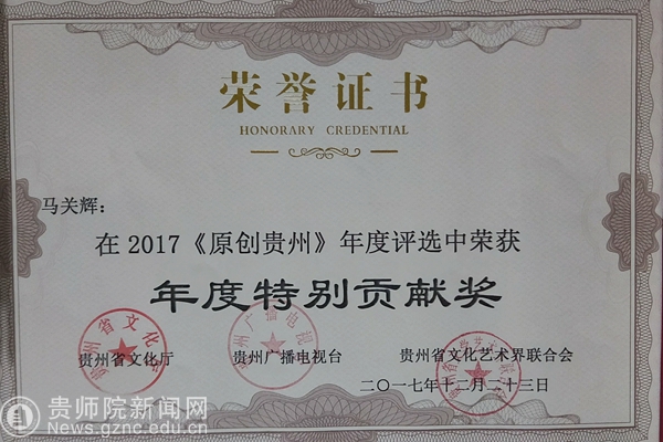 贵州音乐界专家联合音乐先锋榜全国24家成员台对2017参选的作品和歌手进行了评选,最终角逐出“年度最佳男歌手”、“年度最佳女歌手”、“年度十大金曲”、“年度新人”、“听众最喜爱歌手”、“年度特别贡献奖”六大奖项。获奖音乐人不乏省内知名的优秀歌手,他们每一位都各具亮点,演唱的作品都是动人心弦,受到专家老师的高度评价。其中,pp电子艺术学院院长马关辉教授获年度特别贡献奖,《喊一声老黄》、《石门赋》、《山那边》、《月光》等歌曲荣获“年度十大金曲”。