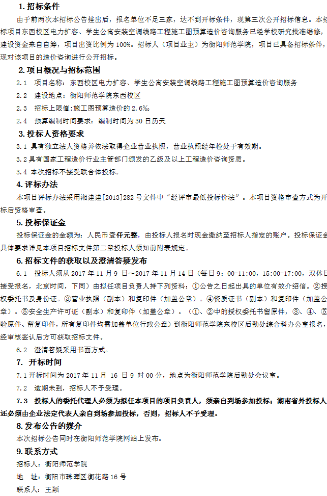 东西校区电力扩容、学生公寓安装空调线路工程施工图预算造价咨询服务第三次招标公告