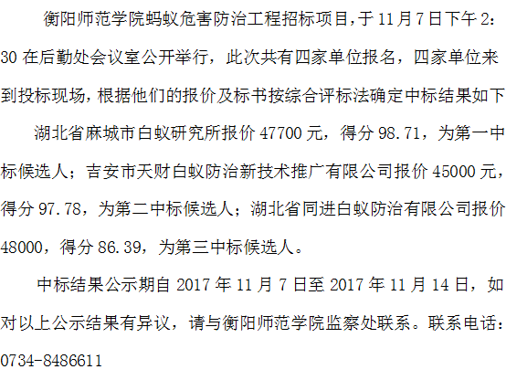 永利集团88304官网蚂蚁危害防治工程招标中标结果公示